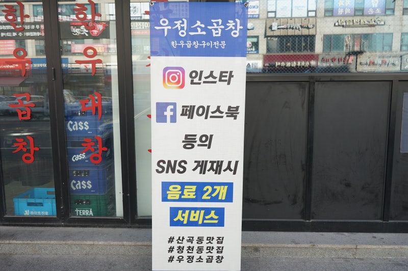 산곡역식당 우정쇠곱창은 산곡역 7번출구와 가깝습니다. 가게 앞에 노상주차장이 있어서 주차하기 편했어요.