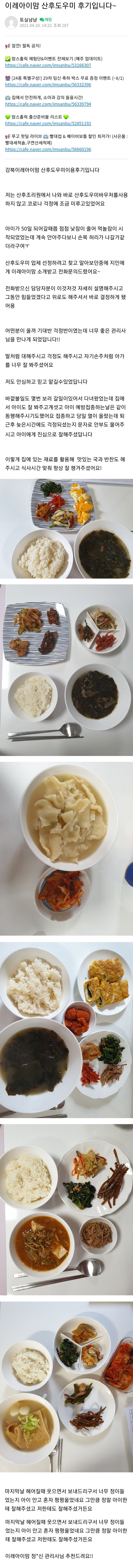 너무 많아서 식사시간마다 기대가 됐어요. 도우미님 덕분에 남편과 나란히 식사하는 시간을 가질 수 있었습니다. 남편도 만족하고 맛있다고 했어요! 저와 남편이 정말 만족했던 점은 위생이었어요! 우리는 매번 손을 자주 씻습니다. 그들은 위생을 매우 중요하게 여겼습니다. 그들은 또한 아이들을 만지기 전에는 항상 손을 씻어야 한다고 말했습니다. 특히!! 수유시간부터 수면, 목욕, 기저귀 갈기, 옷 입기 등… 아이를 데리고 접종하기 쉬웠어요. 그는 우리 아이 몸 구석구석에 발진이나 상처가 있는지 살펴보았습니다. 남편과 저는 단 둘이서 한 아이를 키우느라 힘든 시간을 보냈습니다. 역시 전문가는 다르다~~신랑님도 지인이 출산을 앞두고 있다고 하는데 여기 도우미분이 너무 친절하셔서 추천할정도로 만족! 성북 산후조리원을 찾으신다면 걱정하지 마세요~ 믿을 수 있는 산후도우미를 이곳에서 만나보시길 추천드려요. !