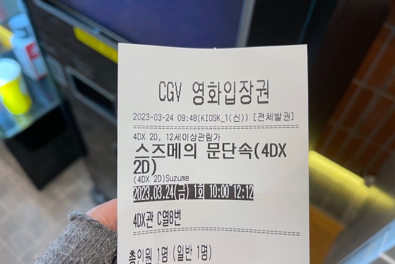 영화 스즈메의 문깨기 4DX 리뷰입니다! 통역리뷰 3주차 스페셜 CGV 2023년 3월 24일 오전 9시 50분. 집 근처 CGV로 다시 스즈메의 도어스텝을 보러 갔습니다. 이 작품을 보는 것은 이번이 세 번째입니다! 지금까지 다양한 형식으로 봐왔는데, 이번주에는 3월 22일 4DX관이 개장한 이후로 그 형식으로 보게 되었습니다. 이 영화를 이런 형식으로 보는 것은 처음이라 정말 기대가 되었어요! 티켓을 발권하고 극장으로 들어갑니다. 그 형식의 작품에 대한 리뷰와 더불어 이번 세 번째 관람에서 본 작품의 일부에 대한 나의 해석도 있습니다. 이번 3주차에 받은 특별한 혜택들에 대한 정보도 함께 올려봅니다. 아직 안보셨다면 꼭 극장으로 가보세요!