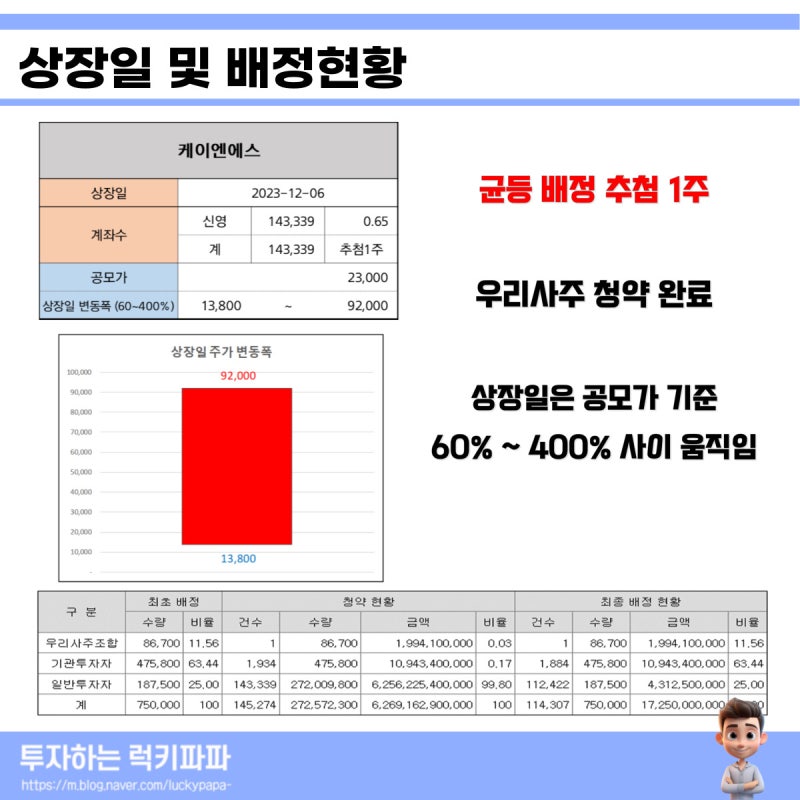 총 143,339명이 참여해 엄청난 경쟁률을 보여줬습니다. 이를 동일한 수의 제안으로 나누면 0.65xx주가 되며, 그 중 일부는 0주를 할당받았고 일부는 1주를 받았습니다. 그리고 저처럼 계좌개설일을 놓치고 아쉽게도 구독을 못하신 분들도 계실텐데요. 의무적립금비율을 살펴보겠습니다. 이전에는 10.9% 정도였지만 가입 후 약 26.9%로 두 배 이상 늘어났다. 동시에 배당가능금액도 소폭 낮아졌는데, 100억원이라는 아주 좋은 금액이다. 분배가능비율은 약 15.5%이다. 이며, 유통 가능 수량은 약 138억개입니다. 상장일 주가가 오르기에는 이것이 최적의 조건인 것으로 보인다. 공모가 23,000원을 반영한 시가총액은 약 893억원이다. 공모가가 23,000원이므로 상장 당일 주가는 13,800원에서 92,000원으로 오를 수 있다. KNS는 2차전지 중 원통형 CID 장비를 생산, 판매하는 회사입니다. 주요 고객사는 이미 대기업인 LGES, 삼성SDI 등이 있고, 경쟁률도 매우 높았는데, 이는 2차전지 사업이기 때문에 충분히 매력적이라고 ​​많은 분들이 생각하셨기 때문일 것입니다. 매출은 꾸준히 증가하고 있으며, 영업이익도 증가하고 있습니다. 아직 청약을 하지 못했기 때문에 상장 당일 분위기를 편안하게(?) 기다려 볼 예정입니다. 와이바이오로직스와 KNS를 구독하신 분들이 성공적으로 판매되셨으면 좋겠습니다! 2023년 12월 공모 청약 예정 기업은? 올해도 이제 한달 남짓 남았습니다. 요즘 공모청약 분위기가 꽤 좋죠? 이 기세를 타고 12월.. blog.naver.com 공모주 청약으로 추가수익 버는 법 최근 에코프로머티리얼즈가 이름에 걸맞게 시장에 상장했고, 분위기도 좋다. 공모주시장 또 달라졌다…blog.naver.com