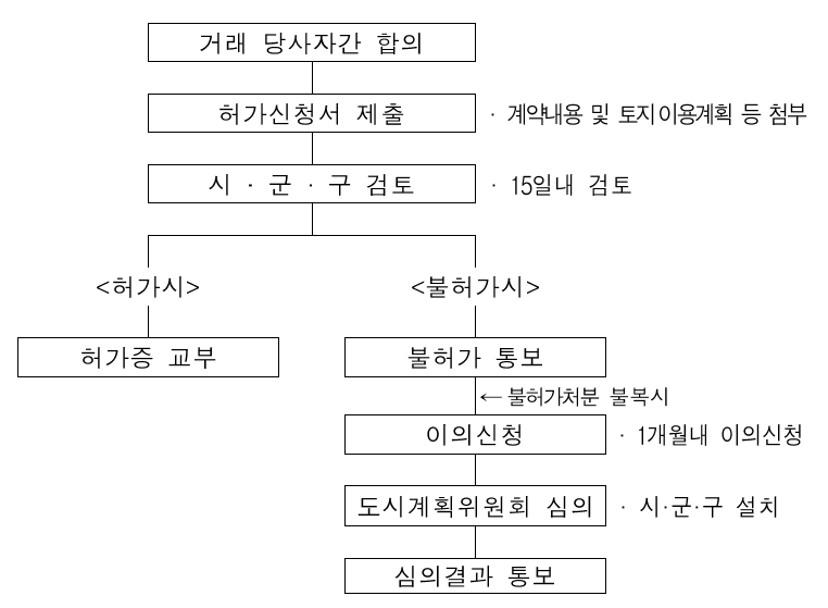 허가 없이는 거래가 없습니다. 실제 사용자인지 여부를 통제할 수 있는 권한을 부여하여 실제 사용자가 아닌 사람은 구매조차 할 수 없도록 합니다. 사유재산을 인정한다 하더라도 국토는 국가를 구성하는 요소이기 때문에 투기세력에 의한 물가상승을 막겠다는 의도가 아닐까 싶습니다. 거래당사자가 공동으로 신청해야 하며, 구매자와 판매자가 공동으로 신청해야 합니다. 대리인은 위임장을 가지고 신청할 수 있습니다. 신청 시 기재하는 사항에는 계약방법, 토지이용계획 등이 포함됩니다. 서류 검토 후 해당 기관과 현장실사 및 업무협의를 거쳐 허가 또는 불승인을 내립니다. 행정처분불복이라는 제도가 있습니다.